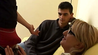 Busty and horny German milf lady on the sofa feding on a hard-on