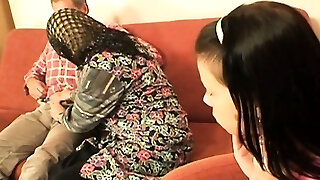 Good looking German honies sucking and taking a hard pecker on the couch