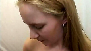 Sizzling blonde in marvelous lingerie and stockings swallows cum and drains